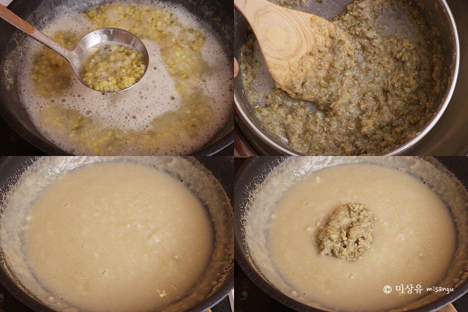 하루 불린 녹두를 충분히 끓이고 체에 내린 후 불려 간 쌀과 함께 끓입니다.